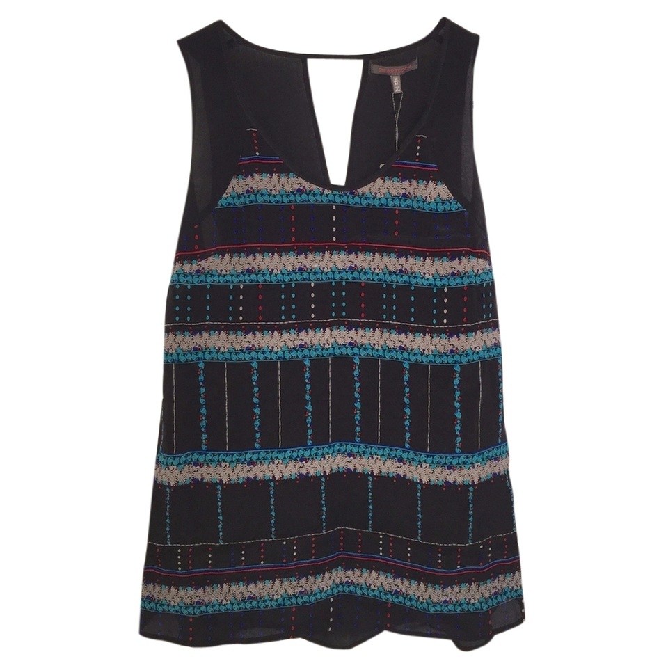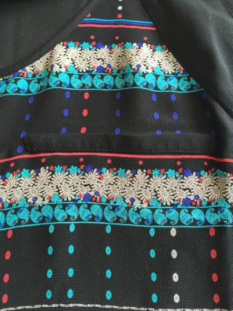 - black with red, blue, turquoise and gray print in front (paisley, floral, polka dot and stripes)